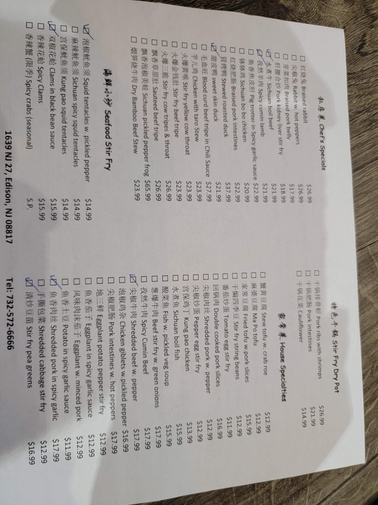 The menu features a tantalizing range of appetizers, such as the Seaweed Salad and the Sichuan Cold Noodle, enticing guests with their refreshing and spicy profiles. For those seeking heartier fare, the Pork Ribs with Shrimp Dry Pot stands out, delivering a punch of flavor that epitomizes Szechuan cuisine.